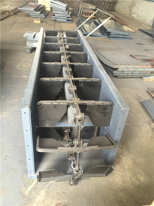 6、埋刮板輸送機進料方式采用兩側(cè)大尺寸通過分流進入,使回程鏈條及刮板與進料隔離,并以不變的大尺寸料層厚度向前輸送。使鏈條及刮板回帶物料的現(xiàn)象不再發(fā)生。借助于運動著的刮板鏈條連續(xù)輸送散壯物料的運輸設(shè)備,埋刮板輸送機。自清式刮板輸送機